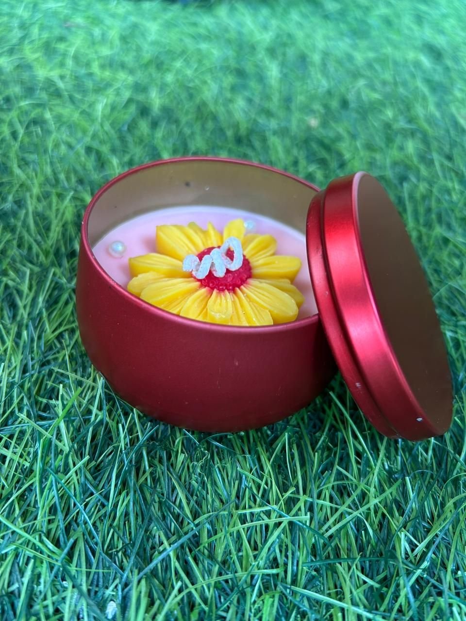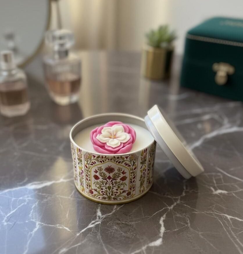 Add a touch of charm to your space with our Floral Tin Candle, beautifully presented in an ornate tin container inspired by traditional Indian motifs. Inside, the candle is topped with a delicate handcrafted wax flower in soft pink and white, making it as lovely to look at as it is to burn.