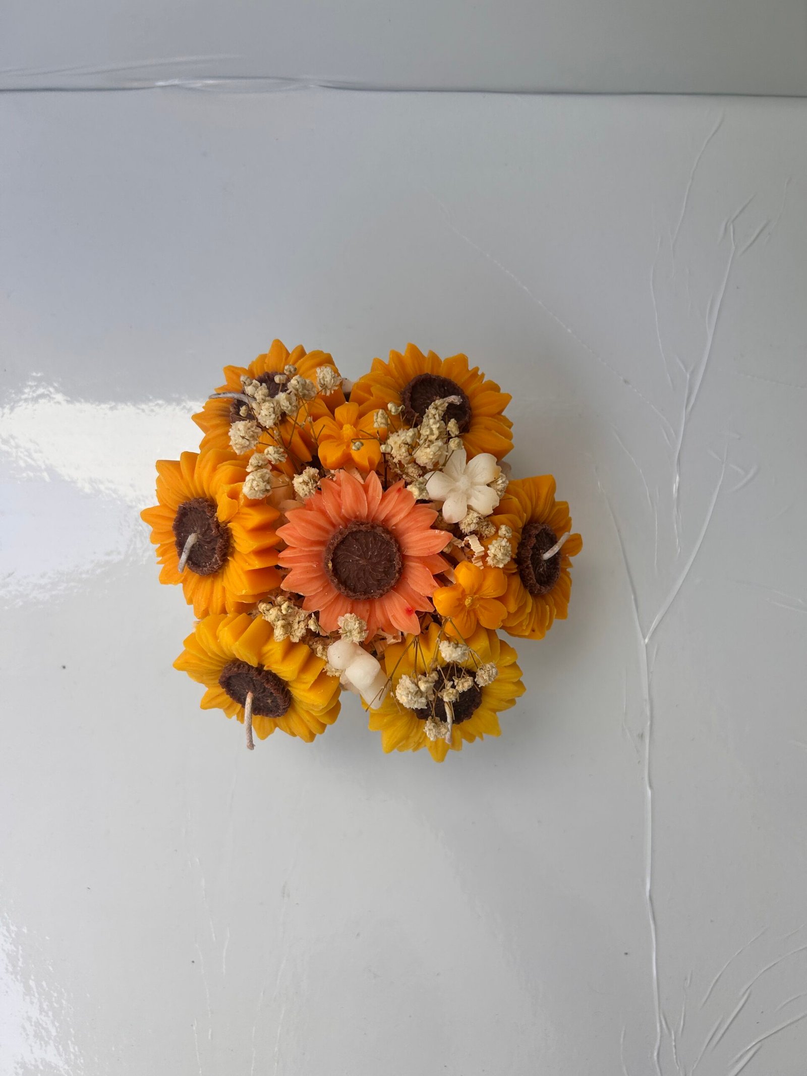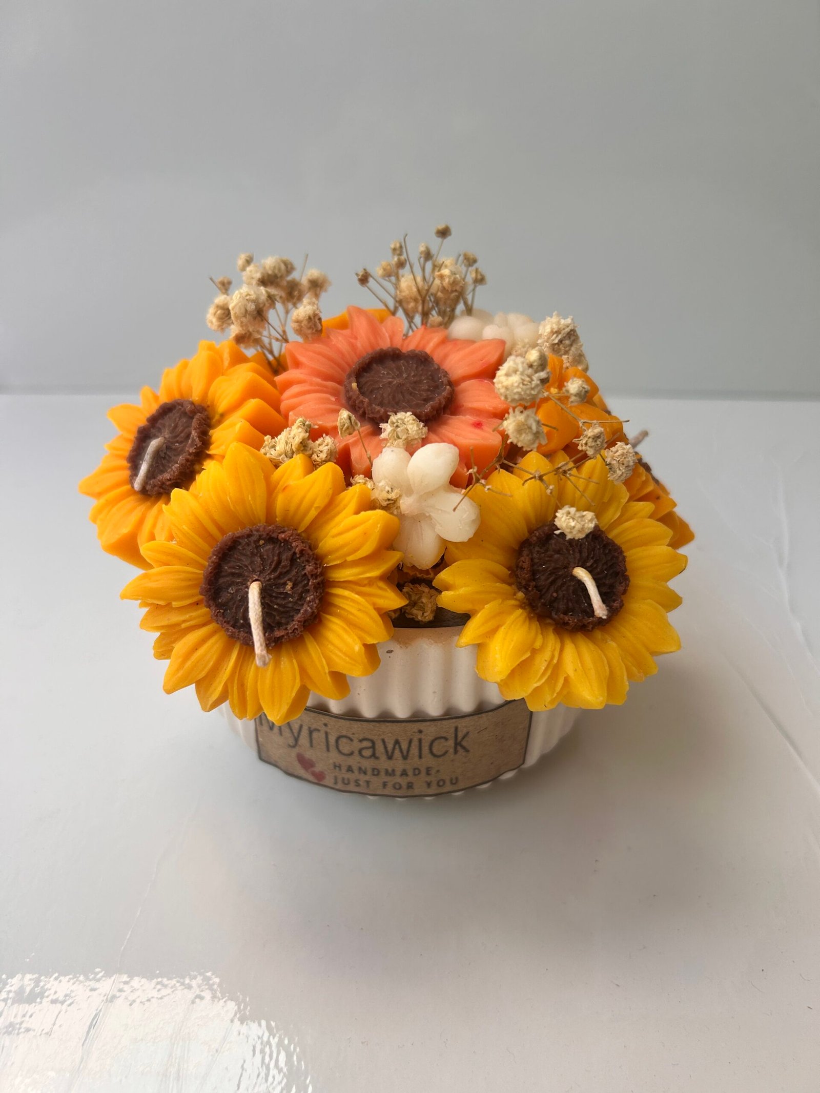 Our Sunflower Bouquet features handcrafted sunflower candles arranged in a premium wrap. Each bloom is individually molded from eco-friendly soy wax and can be burned separately, combining the beauty of flowers with the warmth of candlelight.